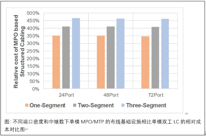以單模CWDM與PSM4為例,下圖顯示了針對不同數(shù)量的“中繼分段”和“端口密度”的結(jié)構(gòu)化布線的相對成本,這表明與雙工LC基礎(chǔ)設(shè)施相比,基于MPO/MTP的基礎(chǔ)架構(gòu)與其相關(guān)的成本增加較多。與基于2芯光纖的雙工LC基礎(chǔ)設(shè)施相比,基于MPO/MTP的PSM4基礎(chǔ)設(shè)施的較高成本顯然來自于光纖芯數(shù)的4倍增長。隨著中繼分段的數(shù)量增加,連接器的數(shù)量也增加,這進一步增加了成本差異。下圖中所示的數(shù)據(jù)表示看出每個端口的通道成本不隨端口密度而變化,而是隨著中繼段的數(shù)量而變化。
