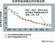 為分析過(guò)去幾年中價(jià)格的大幅度下降情況,KMI查詢(xún)了80年代以來(lái)的常規(guī)單模光纖(CSMF)光纜的價(jià)格,并根據(jù)通貨膨脹因素做了調(diào)整,得到如下價(jià)格趨勢(shì)(以2003年定值美元統(tǒng)計(jì))。 從1983至2003年的年均增長(zhǎng)率(CAGR)為-16%。 從1993至1998年的CAGR為-11%。 從1998至2003年的CAGR為-17%。 2001至2003兩年的變化率為-42%。 2001、2002、2003年的變化率分別為-21%、-24%及-24%。