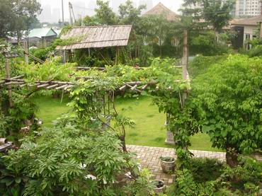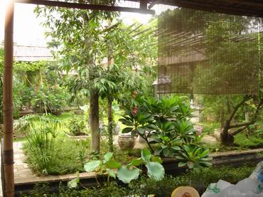 幾間木頭和竹子搭建而成的屋子都是傍水而立,純?nèi)坏膹?fù)古田園意味??邕^(guò)一座小橋,爬上一個(gè)竹梯,便會(huì)出現(xiàn)別有洞天的風(fēng)景;臨水只是幾張木桌,幾個(gè)木凳,愜意即油然而生。水榭邊的那方垂著竹簾,平時(shí)卷了上去,可以欣賞花園的景致,若是垂了下來(lái),也是別有一番風(fēng)味。