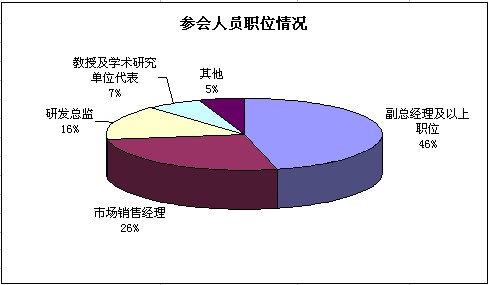 參會人員的職位情況也是大家所關(guān)心的話題,本次研討會副總經(jīng)理以上職位的高層管理者占46%。雖然是市場和技術(shù)的專題研討會,但參與的銷售經(jīng)理職位的明顯多于產(chǎn)品和研發(fā)經(jīng)理。其中也有一部分來自各大學(xué)研究學(xué)院和一些協(xié)會組織代表參加。在其他參與人員中,也有部分風(fēng)險(xiǎn)投資機(jī)構(gòu)的人員參與。