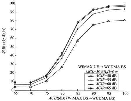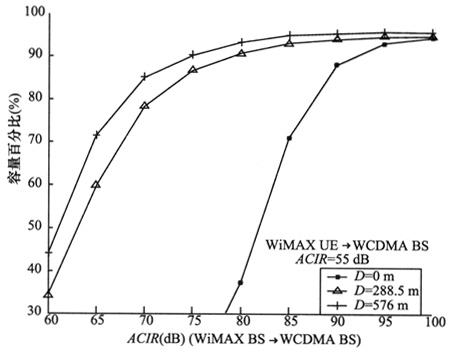 經(jīng)過仿真得到,WiMAX上/下行對WCDMA下行的干擾造成的WCDMA系統(tǒng)容量的損失,在不同的系統(tǒng)布局下都小于3%。如果對設(shè)備指標(biāo)加以限制,WCDMA系統(tǒng)容量的損失將近似可以忽略。