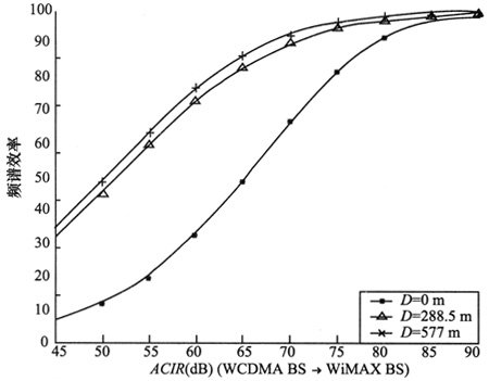 從圖7可以看出,隨著ACIR的增大,WCDMA系統(tǒng)下行對WiMAX系統(tǒng)上行的干擾減小,WiMAX系統(tǒng)頻譜效率損失隨之減小。在相同ACIR的情況下,隨著WiMAX和WCDMA基站距離偏移量的增大為288.5 m和577 m時,由于WCDMA系統(tǒng)的干擾引起的WiMAX頻譜效率的損失逐漸降低。