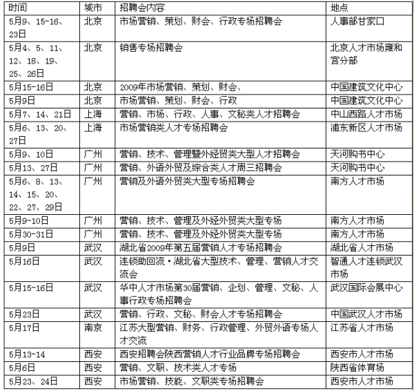 2.一些前幾個月招聘還可以的城市明顯冷淡,如深圳等城市,全國還有幾個省份沒有招聘會,如:貴州、新疆、西藏、黑龍江等邊遠省份。而前幾個月冷淡的城市還有個補充行情,如上海,前幾個月一直比較冷清,5月的60場招聘會將為上海市場來個不錯的行情。而且特點突出,主題鮮明,如表一所示: