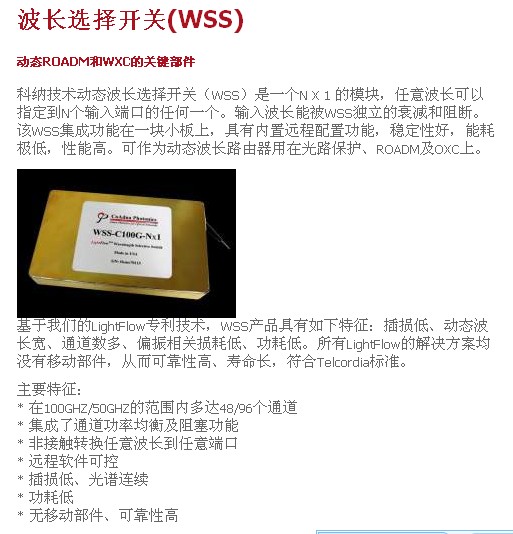 科納自主開發(fā)并擁有專利的 Liquid Crystal (液晶)非常先進,其 LC-based WSS (波長選擇開關(guān)) 和ROADM (可重構(gòu)光分插復用器) 的頻寬達到業(yè)界最寬,可以實現(xiàn)高速的 10Gbps, 40Gbps, 100Gbps 及較遠的傳輸距離,現(xiàn)已廣泛應(yīng)用于北美Verizon等國際一流運營商的骨干智能光網(wǎng)絡(luò)。此外,公司還在全球率先推出最先進的50GHz 1x23 WSS產(chǎn)品,并正在開發(fā)Tunable Filter Array等高端光通信器件。