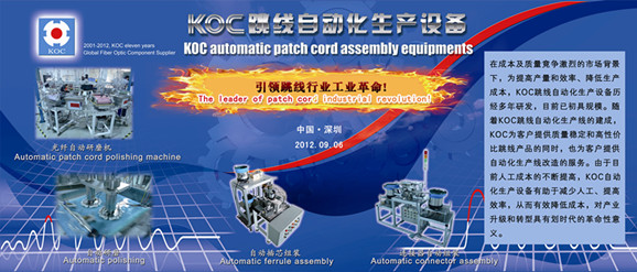 【訊石光通訊咨詢網(wǎng)】 2012年9月7日,訊石記者對深圳嘉萬光通信有限公司進(jìn)行了專訪。走進(jìn)潔白方正的展臺,一副巨大的KOC(深圳嘉萬)跳線自動化生產(chǎn)設(shè)備背景圖畫跳入眼簾,十分醒目。嘉萬夏總告訴訊石記者,這是公司新推出的KOC跳線自動化生產(chǎn)設(shè)備。這一設(shè)備是在成本及質(zhì)量競爭激烈的市場背景下,為提高產(chǎn)量和效率、降低生產(chǎn)成本而研制的,目前已初具規(guī)模。隨著KOC跳線自動化生產(chǎn)線的建成,KOC將會為客戶提供質(zhì)量更為穩(wěn)定,性價比更高的跳線產(chǎn)品,為客戶提供自動化生產(chǎn)線改造服務(wù)。