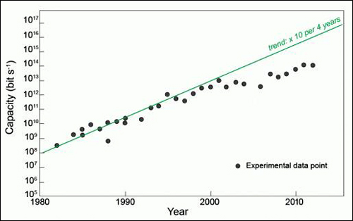 我們知道,光纖傳輸速度快,但因?yàn)楣饷}沖需要逐個(gè)前進(jìn),彼此之間必須保持最小距離以避免信號(hào)干擾,就在光纖內(nèi)形成了無用的空間。二十世紀(jì)七十年代開始,光纖速度差不多每4年就可以提升10倍,但近幾年遇到了瓶頸,提速很慢,全世界的科學(xué)家都在尋求突破。