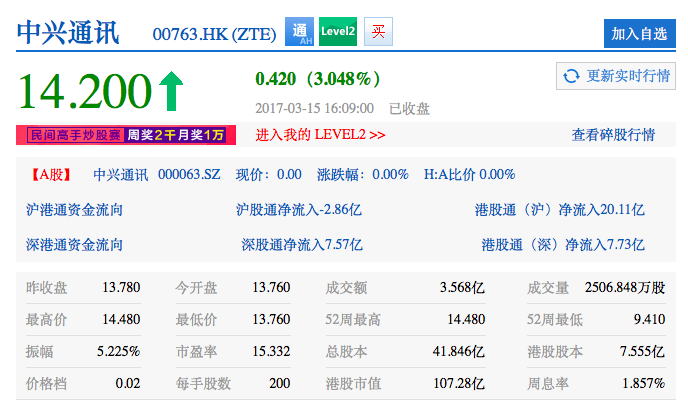 摘要:中興通訊自2017年3月8日開市起臨時停牌,現(xiàn)經(jīng)向深圳證券交易所申請,中興通訊A股股份將于2017年3月16日開市起復(fù)牌,期間中興通訊港股累計漲幅達(dá)16.39%。