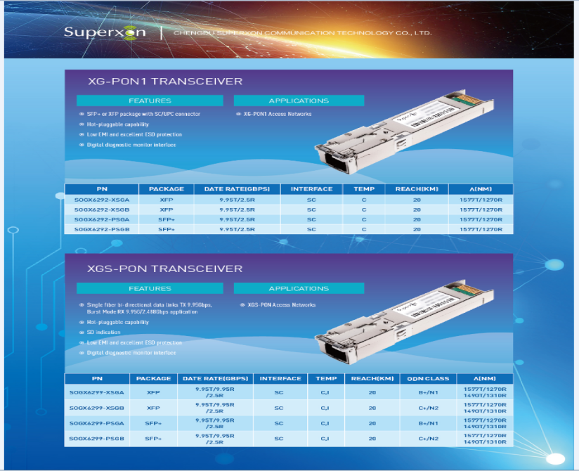 此次參會將重點推出自研小封裝、低功耗、高預(yù)算功率版本的10GEPON OLT SFP+ PR40 , XGSPON OLT SFP+ N2, Combo GPON/XGPON OLT SFP+ D2, Combo GPON/XGSPON OLT SFP+ N2 ,NGPON ONU 等業(yè)界領(lǐng)先的寬帶接入產(chǎn)品,為寬帶提速和平滑升級提供全面的解決方案。同時優(yōu)博創(chuàng)將推出基于自研組件的支持工業(yè)級的25G SFP28和基于自研組件的100G QSFP28 LR/LR-Lite等系列數(shù)通產(chǎn)品,聚焦數(shù)據(jù)中心、云計算領(lǐng)域,為客戶提供全方位的高速率產(chǎn)品解決方案。了解產(chǎn)品詳情請點擊www.superxon.com