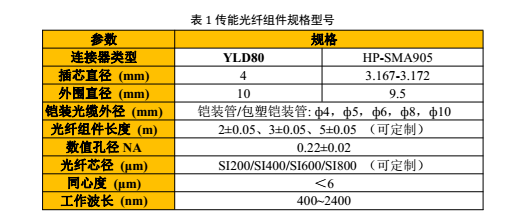 長飛光纖光纜股份有限公司(以下簡稱長飛公司)基于市場應(yīng)用,開發(fā)了系列傳能光纖組件。基本規(guī)格型號如表1。