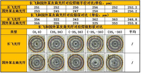 長飛公司和國外某友商公司類結(jié)構(gòu)200μm纖芯傳能光纖組件在焊斑形狀及焊斑半徑兩個指標上相近,在熔深指標上,長飛光纖略低于國外某友商光纖,但因這種差異較小,在實際使用中影響甚微。