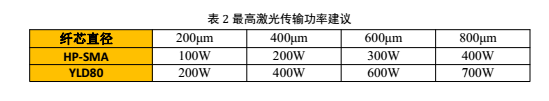 傳能光纖組件的主要部件是其中的傳能光纖及相應(yīng)的光纖連接器。長飛公司作為技術(shù)領(lǐng)先的特種光纖研發(fā)及生產(chǎn)廠商,可以針對不同應(yīng)用及所需傳輸激光的特點,選擇或研發(fā)適用的光纖并選配相應(yīng)的光纖連接器。表2就半導(dǎo)體激光器應(yīng)用,給出了最高激光傳輸功率的建議供客戶作為選擇依據(jù)。在光纖激光器的激光傳輸中,相同芯徑的光纖在QBH連接器的配合使用下,所傳輸?shù)淖罡呒す夤β士梢愿摺?