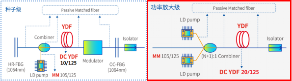 當(dāng)前,光纖激光器主要采用模塊化設(shè)計(jì),模塊化更利于結(jié)構(gòu)設(shè)計(jì)與組裝生產(chǎn),后期檢修維護(hù)簡(jiǎn)單高效。同時(shí)模塊化后,單個(gè)激光器也能作為能量模塊用于并列集成更高功率激光器,且運(yùn)行可靠性更高。基于以上原因,電學(xué)和光學(xué)分層設(shè)計(jì)組裝,光纖分層中最為重要的放大模塊根據(jù)功率和作用不同,分別設(shè)計(jì)成種子級(jí)模塊和增益放大模塊(以下簡(jiǎn)稱Gain Block)兩部分。