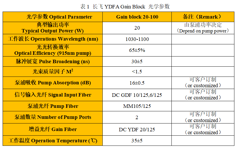 目前主要推出面向適用于MOPA及調(diào)Q的20W打標(biāo)光纖激光增益放大模塊,指標(biāo)如表1。在提供Gain Block的同時(shí),長(zhǎng)飛公司也將提供優(yōu)化的光纖熔接等技術(shù)服務(wù)。