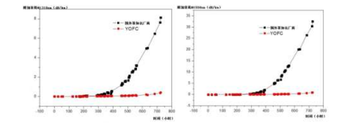 我們實(shí)驗(yàn)驗(yàn)證了長(zhǎng)飛PI光纖與某國(guó)際知名廠商PI光纖的高溫穩(wěn)定性。實(shí)驗(yàn)將兩種光纖在300℃的環(huán)境中存放700h以上,并對(duì)其進(jìn)行附加衰耗的測(cè)試,從圖2可以看出,長(zhǎng)飛公司所生產(chǎn)的PI光纖在高溫環(huán)境下表現(xiàn)出了更好的穩(wěn)定性,在1310nm以及1550nm兩個(gè)波段的附加衰耗均小于0.2dB/km。其附加衰耗值遠(yuǎn)低于某國(guó)際知名廠商所生產(chǎn)的PI光纖。