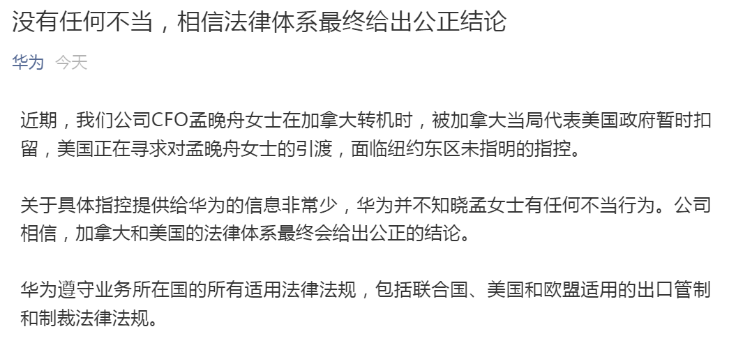 關(guān)于具體指控提供給華為的信息非常少,華為并不知曉孟女士有任何不當(dāng)行為。公司相信,加拿大和美國的法律體系會(huì)最終會(huì)給出公正的結(jié)論。