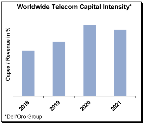 “雖然資本支出/收入之間的關(guān)系可能會隨著時間的推移而保持強勁,而運營商收入增長的受限將進(jìn)一步抑制電信資本的增長,但我們?nèi)匀粯酚^地認(rèn)為短期內(nèi)存在一些偏差以適應(yīng)5G部署,”Dell'Oro高級主管Stefan Pongratz表示。