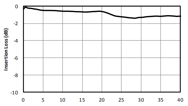 插入損耗可以用網(wǎng)絡(luò)分析儀的S21參數(shù)進(jìn)行評估,插入損耗反映了系統(tǒng)傳輸路徑的情況,插入損耗的數(shù)值越小代表指標(biāo)越好。如圖1-3所示為典型的BiasT的S21參數(shù)測試圖,從圖中可以看出在5GHz的頻點,BiasT的插損約為0.5dB;在30GHz的頻點,BiasT的插損約為1.3dB。0.5dB<1.3dB,說明5GHz的插損指標(biāo)更好,插入損耗的絕對值值越小代表指標(biāo)越好。
