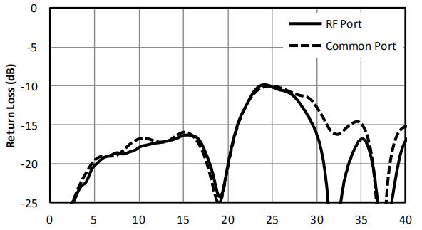 如圖1-5所示為典型的BiasT回波損耗參數(shù)測試圖。圖中可以看出,在25GHz頻點時回波損耗=-10dB,說明反射了1/10的功率;在5GHz頻點時回波損耗為-20dB,代表反射了1%的功率,即回波損耗數(shù)值越小越好。