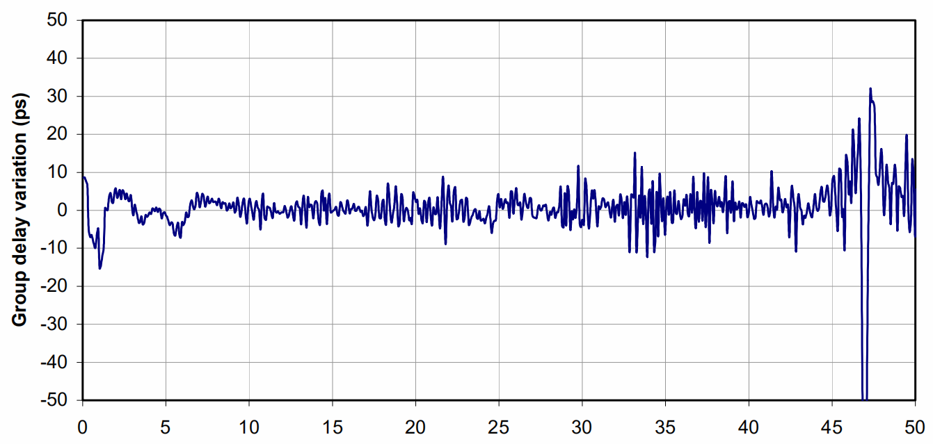 群時延即系統(tǒng)在某頻率處的相位(相移)對于頻率的變化率。寬帶信號經(jīng)過媒質(zhì)傳輸路徑或設(shè)備中的線性元件時,其各個頻譜分量的相速不同,元器件對各頻譜分量的響應(yīng)也不一樣,這都會引起到達(dá)接收端的信號因各頻率分量的相移或時延不同而產(chǎn)生相位關(guān)系的紊亂,即相位失真。理想的群時延曲線應(yīng)該是一條沒有波動的直線。群時延的振動幅度越小越好。