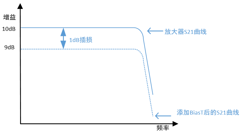 經(jīng)過前兩步的篩選,可以保證BiasT能夠應(yīng)用于放大器。BiasT給放大器饋電,兩者在同一傳輸鏈路中,最終的增益是兩者S21參數(shù)的疊加。如圖1-10所示為放大器與BiasT在傳輸鏈路中的示意圖。當(dāng)放大器增益為10dB,BiasT的插損為-1dB時,最終輸出的增益為9dB。選擇BiasT的時候要關(guān)注S21參數(shù)的最大插損,將放大器增益與BiasT插損疊加得出最終輸出的增益值,用以判斷是否符合使用要求。