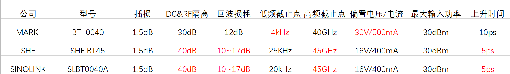 當(dāng)放大器需要添加BiasT進(jìn)行饋電的時候,重點關(guān)注BiasT的某些指標(biāo):BiasT通頻帶、RF端輸入功率最大值、S21參數(shù)、S22參數(shù)、S11參數(shù)、上升下降時間和抖動等。