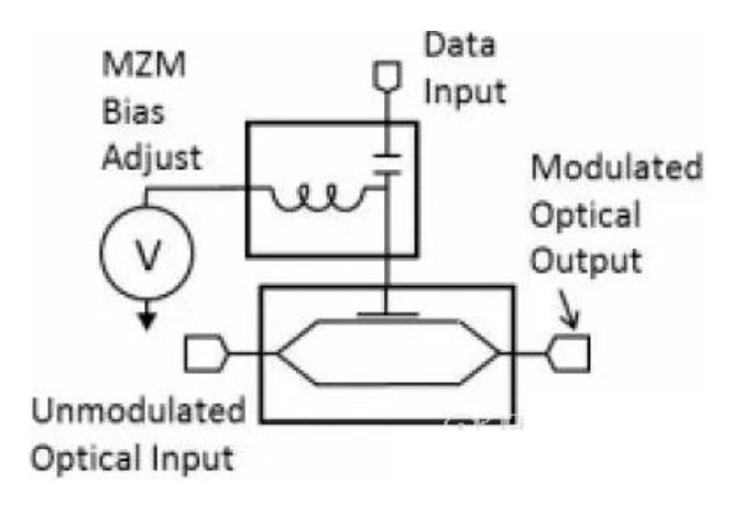BiasT可以用于電光調(diào)制器的直流偏置端口,是一項十分成熟的應(yīng)用,BiasT已成為電光調(diào)制器的必備組件。在電光調(diào)制過程中,BiasT扮演著至關(guān)重要的角色。如圖1-13所示為BiasT驅(qū)動電光調(diào)制器的示意圖,BiasT的RF端作為調(diào)制器的數(shù)據(jù)輸入源,DC端作為MZM偏置調(diào)節(jié)的供電輸入,RF&DC端把信號輸入調(diào)制器,完成電光調(diào)制??梢钥闯鰶]有BiasT就無法完成電光調(diào)制器的調(diào)制。