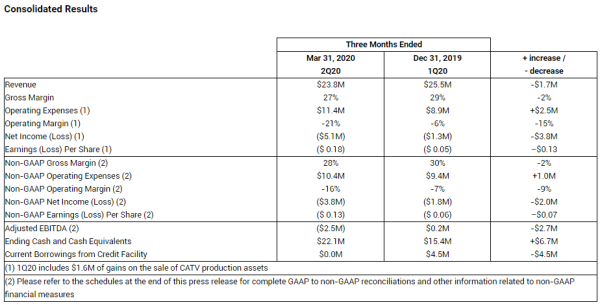銷售收入為2380萬美元,環(huán)比下降6%。其中航空和國防業(yè)務(wù)銷售收入1300萬美元,環(huán)比減少70萬美元;寬帶業(yè)務(wù)銷售收入1080萬美元,環(huán)比減少100萬美元,下滑主要由于CATV和芯片產(chǎn)品收入下降。GAAP毛利率27%,上個(gè)季度29%。非GAAP毛利率28%,上個(gè)季度30%。GAAP凈虧損510萬美元(其中包含出售CATV生產(chǎn)資產(chǎn)的160萬美元收益),非GAAP凈虧損380萬美元。上個(gè)季度GAAP凈虧損130萬美元,非GAAP凈虧損180萬美元。調(diào)整后的EBITDA值為負(fù)的250萬美元。