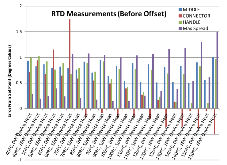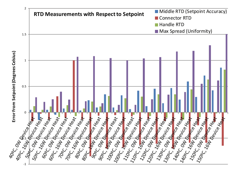 圖1展示了不同功率、溫度、位置的溫度誤差圖。測量最大與最小值之間的偏差(紫色表示)隨著設(shè)定溫度的增高趨于增大,并且,在大部分條件下具有正的誤差。