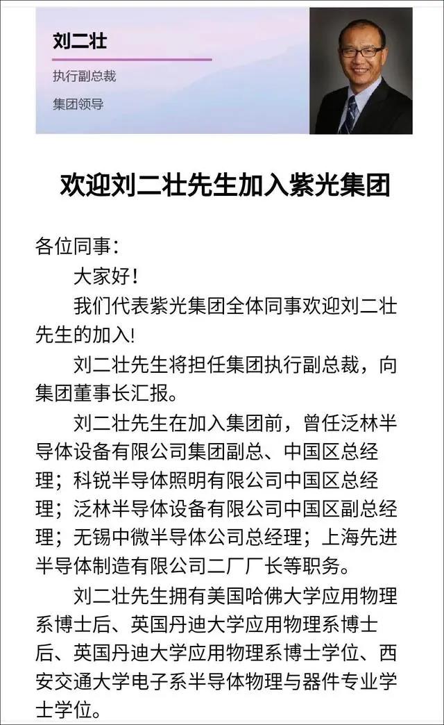 ICC訊 紫光集團(tuán)內(nèi)部發(fā)布消息,原泛林集團(tuán)副總裁兼中國(guó)區(qū)總經(jīng)理劉二壯博士正式加入該集團(tuán),擔(dān)任紫光集團(tuán)執(zhí)行副總裁,向該集團(tuán)董事長(zhǎng)趙偉國(guó)匯報(bào)。