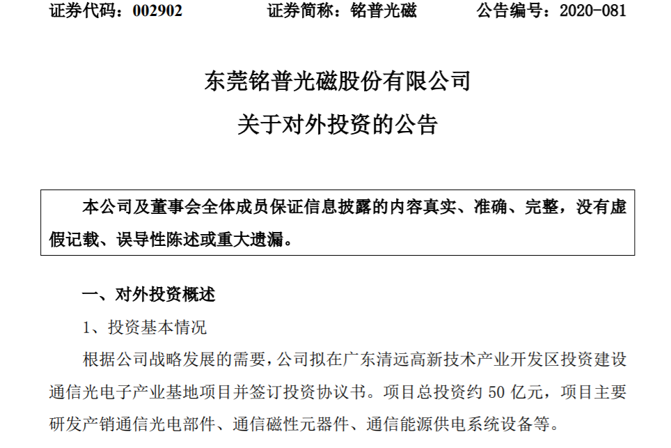 ICC訊 (編輯:Nicole)近日,東莞銘普光磁股份有限公司(以下簡(jiǎn)稱:銘普光磁或公司)公告稱:根據(jù)公司戰(zhàn)略發(fā)展的需要,公司擬在廣東清遠(yuǎn)高新技術(shù)產(chǎn)業(yè)開發(fā)區(qū)投資建設(shè)通信光電子產(chǎn)業(yè)基地項(xiàng)目并簽訂投資協(xié)議書。項(xiàng)目總投資約 50 億元,項(xiàng)目主要研發(fā)產(chǎn)銷通信光電部件、通信磁性元器件、通信能源供電系統(tǒng)設(shè)備等。