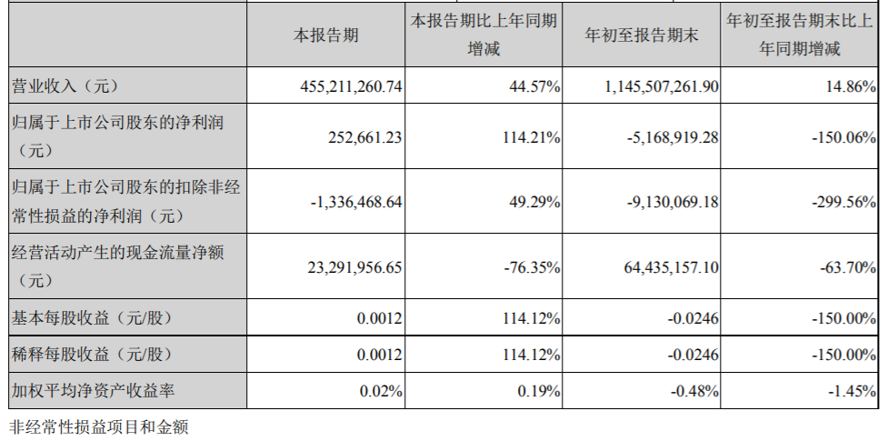 年第三季度業(yè)績報告:報告期內(nèi),公司實現(xiàn)營收4.55億元,同比增長44.57%;歸屬于上市公司股東的凈利潤25.27萬元,同比增長114.21%。