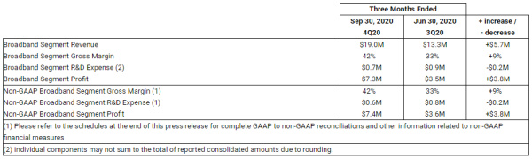 銷售收入為3350萬(wàn)美元,上個(gè)財(cái)季為2730萬(wàn)美元,環(huán)比增長(zhǎng)23%。其中航空和安防部門銷售收入1450萬(wàn)美元,寬帶部門銷售收入1900萬(wàn)美元。GAAP毛利率37%,上個(gè)財(cái)季34%;非GAAP毛利率38%,上個(gè)財(cái)季34%。GAAP凈收入70萬(wàn)美元,非GAAP凈收入290萬(wàn)美元,相比上個(gè)季度GAAP凈虧損130萬(wàn)美元,非GAAP凈虧損70萬(wàn)美元。調(diào)整后EBITDA值為正的400萬(wàn)美元,上個(gè)財(cái)季為正的30萬(wàn)美元。