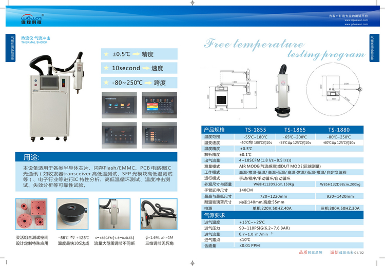 偉煌科技的熱流儀具有多重優(yōu)勢:能夠靈活組合測試空間,設(shè)計定制特殊應用;-55℃到+125℃,溫度最快10S達成;4~18SCFM(1.8~8.5L/S),流量大范圍調(diào)節(jié)不間斷;三維調(diào)節(jié)無死角。