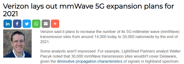 一些分析師對(duì)此并不買賬。例如,LightShed Partners的分析師Walter Piecyk指出,鑒于信號(hào)在高頻段的微弱傳播特性,30000個(gè)毫米波的發(fā)射點(diǎn)連特拉華州都無法覆蓋。
