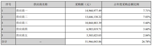 此外,公告還公布了前五名供應(yīng)商合計采購金額5196.6萬元,合計采購金額占年度采購總額比例26.78%,其中前5名供應(yīng)商資料如下: