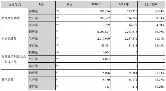 其他器件生產(chǎn)量、銷售量分別較上年增長36.27%、35.64%,主要是光纖器件相關(guān)應(yīng)用領(lǐng)域不斷發(fā)展,公司訂單增加,產(chǎn)銷量增長所致。本報告期末其他器件庫存量同比增長30.26%,主要是上年末庫存量基數(shù)較小所致,2020年末庫存量處于合理庫存水平。