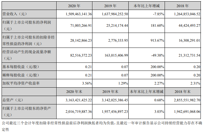 ICC訊 (編輯:Anton)4月28日,廣東通宇通訊股份有限公司(簡(jiǎn)稱(chēng):通宇通訊)發(fā)布2020年年度報(bào)告,報(bào)告期內(nèi),營(yíng)收15.09億元,比上年減少7.85%;歸屬于上市公司股東凈利潤(rùn)7100.33萬(wàn),同比增長(zhǎng)181.60%。
