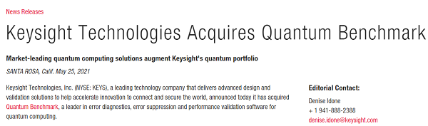 ICC訊(編譯:Nina)上周二(2021年5月25日),是德科技(Keysight Technologies, Inc.)(紐交所:KEYS)宣布已收購Quantum Benchmark,后者是用于量子計算的錯誤診斷、錯誤抑制和性能驗證軟件的領(lǐng)導(dǎo)者。