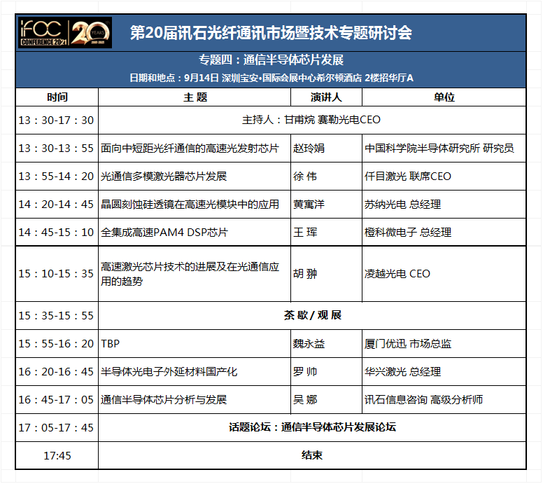 ICC訊 2021年9月14日-15日,第20屆訊石光纖通訊市場暨技術專題研討會(The 20th Infostone Optical Communication Market and Tchnology Conference,簡稱“IFOC訊石研討會”)邀您共聚深圳國際會展中心希爾頓酒店(寶安區(qū)展豐路80號),從七大專題深入探討覆蓋整個光通訊市場的全面內容,層層遞進式分析技術發(fā)展趨勢,深度融入熱點話題為行業(yè)發(fā)展注入新鮮力量。