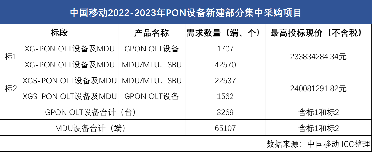 ICC訊 10月26日,中國移動發(fā)布2022-2023年PON設備新建部分集中采購項目公告,計劃采購OLT設備3269臺,MDU設備6.51萬端,采購滿足期為1年,實際采購量以采購合同為準。