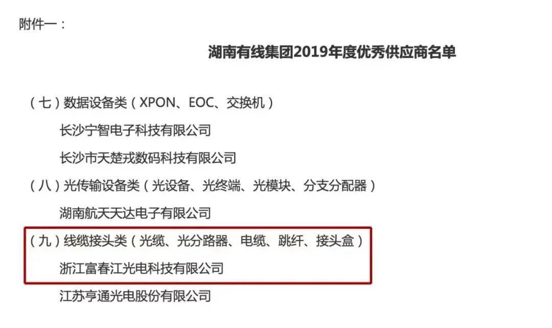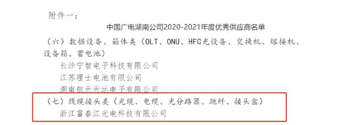 2021年12月31日,富春江光電上榜中國(guó)廣電湖南公司線纜接頭類(lèi)2020-2021年度優(yōu)秀供應(yīng)商名單。