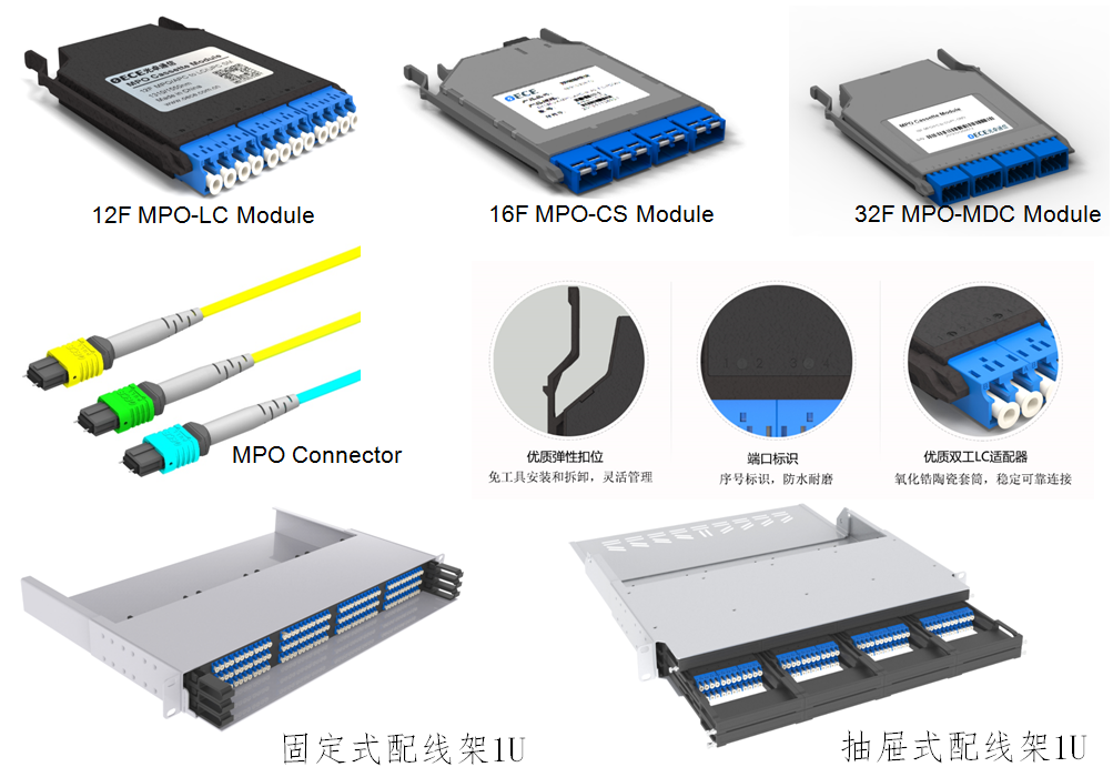 針對(duì)目前數(shù)據(jù)中心布線狀況,光卓通信推出數(shù)據(jù)中心超高密度光纖布線解決方案,采用16芯MPO多芯光纖連接器以及CS小型化光纖連接器。該方案簡單且易于管理,在滿足現(xiàn)有100G的需求下也為即將批量部署的400G以太網(wǎng)提供堅(jiān)實(shí)的光纖鏈路基礎(chǔ),以減少客戶對(duì)光纖資源的重復(fù)投入,實(shí)現(xiàn)客戶的最大成本控制優(yōu)勢(shì)。