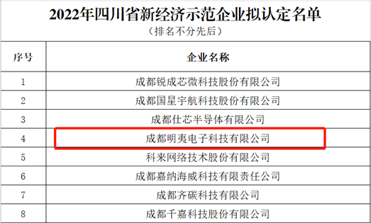 ICC訊 近日,四川省經(jīng)濟和信息化廳發(fā)布《關于2022年四川省新經(jīng)濟示范企業(yè)擬認定名單的公示》。擬認定名單經(jīng)企業(yè)自主申報、市(州)推薦、專家評審、企業(yè)答辯、現(xiàn)場核查等程序后產(chǎn)生,全省共30家企業(yè)入選,明夷科技光榮上榜。