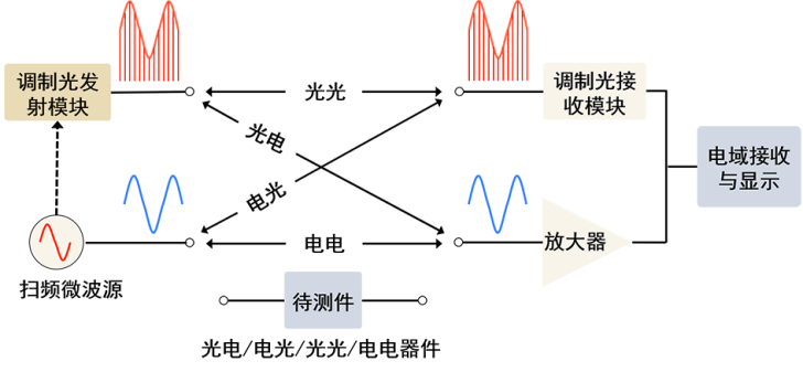 GOCA-110通用光電元器件分析儀采用“微波光子技術(shù)”,突破了傳統(tǒng)方法對測量分辨率和相位精確度的限制。通過寬帶電-光、光-電轉(zhuǎn)換,實(shí)現(xiàn)微波頻譜掃描向光波光譜掃描的映射;配合電-光、光-電和光-光校準(zhǔn)技術(shù),輔以高精度的微波幅相接收,實(shí)現(xiàn)大帶寬、高精度、高分辨率的電-光、光-電和光-光元器件頻譜響應(yīng)測試。在頻率分辨率、幅度準(zhǔn)確度、相位精確度和動態(tài)范圍等關(guān)鍵參數(shù)上,均完成大幅度提升,實(shí)現(xiàn)技術(shù)突破。