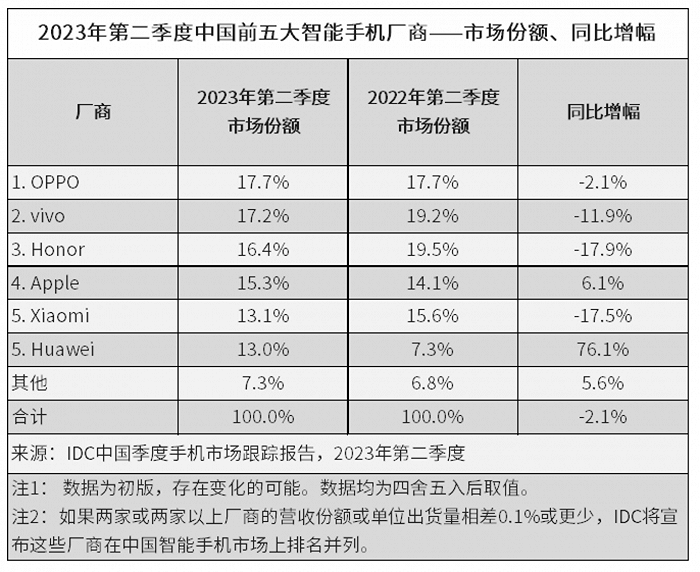 ICC訊  據(jù)國際數(shù)據(jù)公司最新發(fā)布的報告顯示,2023年第二季度,華為市場份額相比去年同期暴增76%,繼制裁之后再度回到前五名的位置!