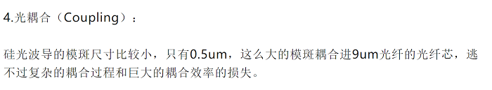 回答:文章提到 “硅光波導(dǎo)的模斑尺寸比較小,只有0.5μm,這么大的模斑耦合9μm光纖的光纖芯,逃不過復(fù)雜的耦合過程和巨大的耦合效率的損失”,這個說法是巨大的錯誤!一般硅光的波導(dǎo)截面尺寸是450nm×220nm,這不代表模斑尺寸是0.5μm。如果還是0.5μm對9μm,那硅光技術(shù)連做產(chǎn)品的機會都沒有,耦合器也是硅光芯片這些年中獲得重點突破的技術(shù)點之一。目前技術(shù)領(lǐng)先的硅光公司已經(jīng)可以做到不論是激光器-硅光芯片還是硅光芯片-光纖的耦合,模斑都可以接近9μm的光纖模斑尺寸,實現(xiàn)約1dB甚至<1dB的耦合損耗,完全滿足了硅光模塊產(chǎn)品的需求。