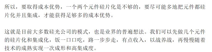 該文章提到了“大多數(shù)硅光公司的模式是先做幾個元件的硅片化和集成化,也是業(yè)界的普遍想法”,恰恰相反,這并不是業(yè)界的普遍想法,當(dāng)然集成度也是有發(fā)展曲線,硅光的技術(shù)路線上是規(guī)?;墓δ芄饧勺鳛槠瘘c、光芯片的大規(guī)模高密度集成、光電3D集成或單片集成,在產(chǎn)品上則是市場需求和技術(shù)發(fā)展之間的動態(tài)平衡。