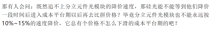 殊不知,硅光作為集成電路產(chǎn)品,規(guī)模制造的優(yōu)勢就是量越大、成本越低,在當(dāng)前硅光規(guī)模還不夠大的情況下,已經(jīng)與分立器件模塊方案有競爭優(yōu)勢,后續(xù)上量后,跟隨成本優(yōu)化的節(jié)奏會表現(xiàn)更好,這本身就是集成電路行業(yè)的魅力所在。至于作者自己假想的無意義的假設(shè),什么硅光要等到分立光模塊降到平臺期再去競爭也沒競爭力,更是莫名其妙。硅光產(chǎn)生優(yōu)勢的正是高速的光模塊應(yīng)用,而硅光在高速領(lǐng)域大量應(yīng)用獲得批量的優(yōu)勢后,反而存在到相對低速和消費級互連領(lǐng)域獲得降維打擊能力的可能性。