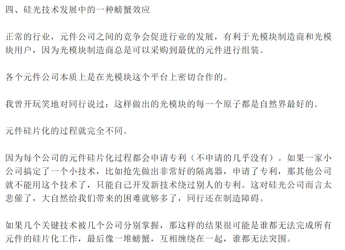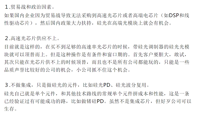 回答:作者給出了硅光的發(fā)展方向和條件,不得不說都不算是好主意。貿(mào)易戰(zhàn)和政治因素帶來的不是正面優(yōu)勢,而是負(fù)面,真正有能力的硅光公司是敢于面對國際競爭的,硅光行業(yè)是全球競爭的行業(yè),不是靠國內(nèi)保護生存。供應(yīng)的問題前面已經(jīng)講過了。硅光公司不做集成,做單器件?作者跟前面有點自相矛盾了,我們在前面也對此做了充分的分析。