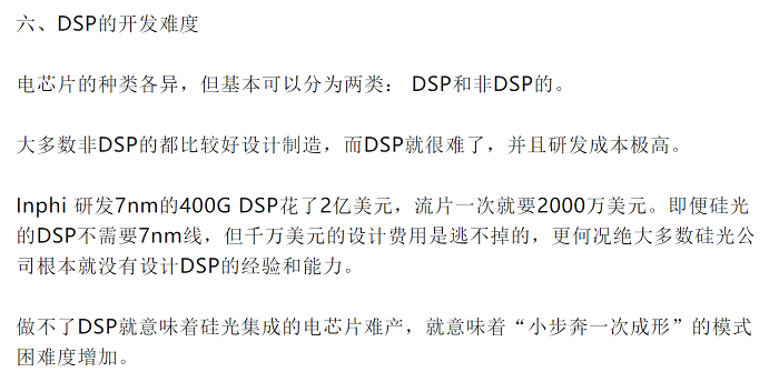 最后,如果作者用“DSP”和“非DSP”想表達的是采用DSP或者Driver/TIA,那么 “非DSP”并不好設(shè)計制造,如前文所述,目前我們國內(nèi)甚至都還缺乏高速GeSi量產(chǎn)工藝平臺,因此這些“非DSP”首先要依靠國外平臺,還要具備多年的產(chǎn)品經(jīng)驗積累,非常有挑戰(zhàn)性,完全不是“比較好設(shè)計制造”。